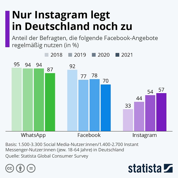 Demnach sind die Deutschen inzwischen WhatsApp und Facebook-müde: So sank der Anteil derjenigen, die beide Apps nutzen, seit 2018 deutlich – beim Messenger von 95 auf 87 Prozent, beim sozialen Netzwerk sogar von 92 auf 70 Prozent:
