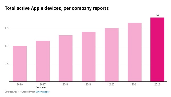Diese immer größer werdende installierte Basis spült in ihrer Bugwelle auch immer mehr Service-Umsätze in die Kassen: Denn immer mehr aktive Geräte – vulgo: Nutzer – kaufen auch mehr Apps oder Streaming-Dienste wie Apple Music: