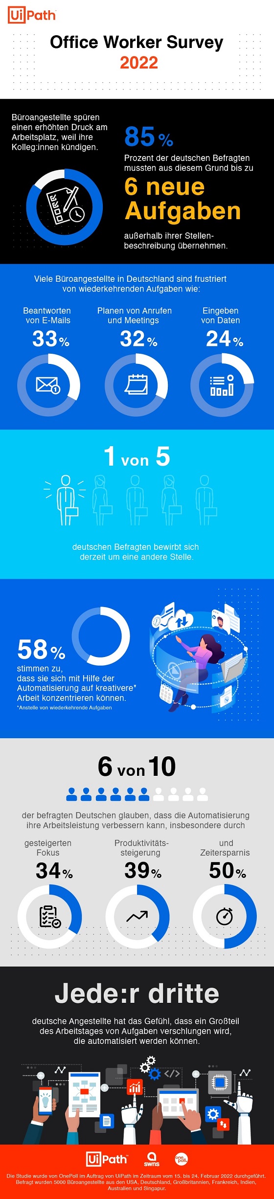 Jeder dritte deutsche Angestellte hat das Gefühl, dass ein Großteil des Arbeitstages von Aufgaben verschlungen wird, die automatisiert werden können. Darüber hinaus glauben neun von zehn befragten Deutschen, dass die Automatisierung ihre Arbeitsleistung verbessern kann, insbesondere durch Zeitersparnis (50 Prozent), Produktivitätssteigerung (39 Prozent) und die Möglichkeit, sich auf wichtigere Aufgaben zu konzentrieren (34 Prozent). Mehr als die Hälfte stimmt zu, dass sie sich mit Hilfe der Automatisierung auf kreativere Arbeit konzentrieren kann (58 Prozent).