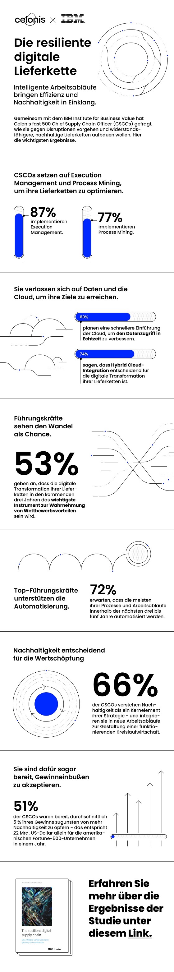 Wenig verwunderlich also, dass für mehr als jeden zweiten Logistikverantwortlichen in den Unternehmen die digitale Transformation ihrer Lieferkette in den nächsten drei Jahren das wichtigste Instrument für mehr Widerstandsfähigkeit ist (53 Prozent). Das ist der zentrale Befund einer gemeinsamen Studie von IBM und dem Process-Mining-Anbieter Celonis unter 500 Chief Supply Chain Officern (CSCOs).