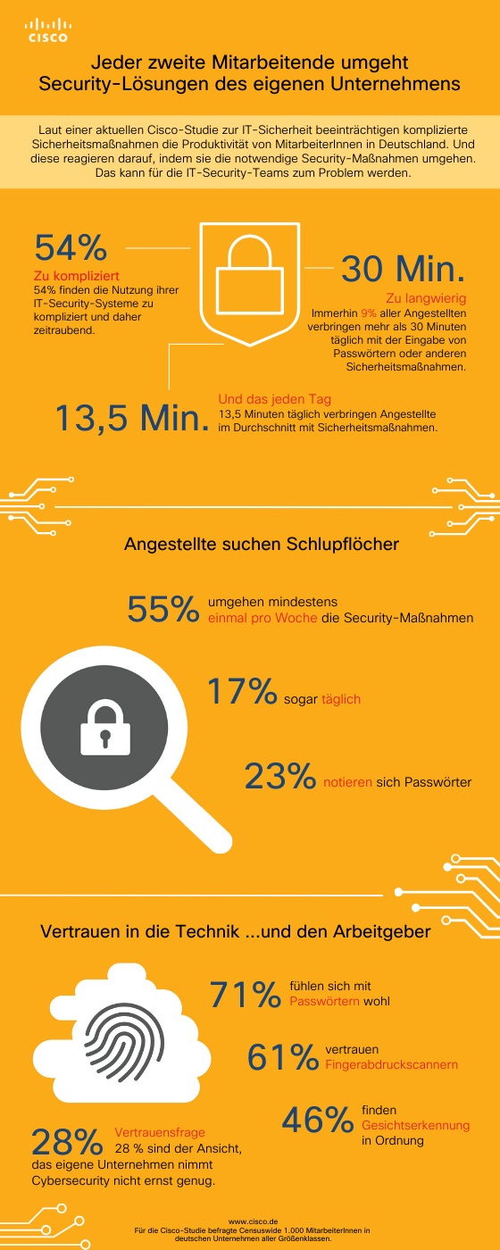 Mehr als die Hälfte aller Mitarbeiter in Deutschland finden die Nutzung der IT-Security-Systeme zu kompliziert und zeitraubend (54 Prozent). Das zeigt eine aktuelle Befragung von Cisco unter mehr als 1000 Angestellten in Deutschland. „Kroker’s Look @ IT“ veröffentlicht die Ergebnisse der Studie exklusiv vorab.