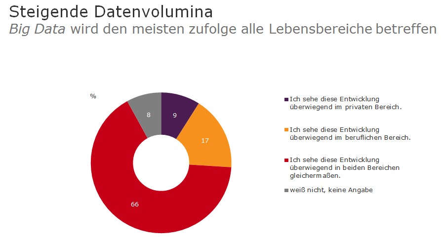 So erkennen insgesamt mehr als acht von zehn Befragten einen deutlichen Trend zur Verarbeitung immer größerer Datenmengen im Unternehmen (66% privat und beruflich + 17% nur beruflich). Insgesamt erwartet die große Mehrheit der 300 an der Studie teilgenommenen Firmen, dass Big Data künftig alle Lebensbereiche betreffen wird.