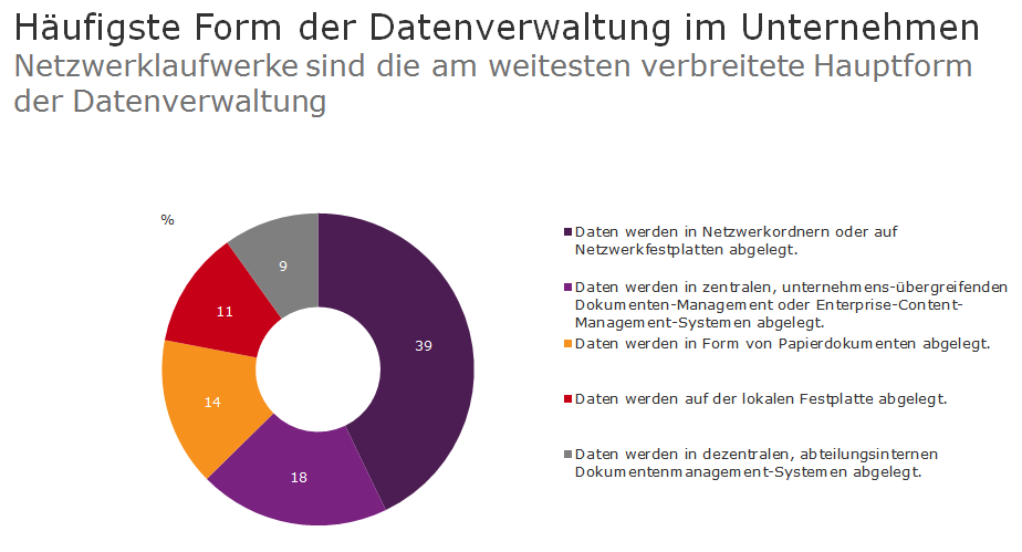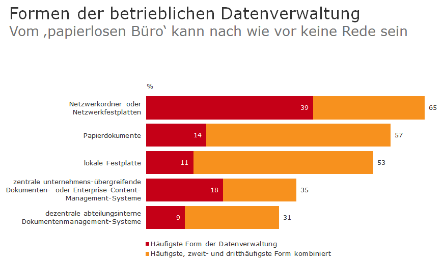 Umgekehrt spielen bis heute Papierdokumente in vielen Unternehmen noch eine große Rolle: Für 14 Prozent der Befragten ist dies immer noch die wichtigste Form der Datenhaltung; eine deutliche Mehrheit von 57 Prozent nutzt Papier bis heute als Backup für elektronische Daten: