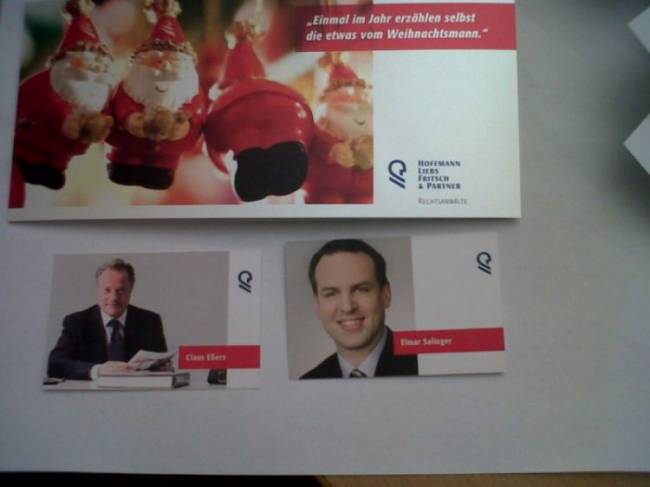 Hevorstechend war auch diese Karte einer Kanzlei, die nicht nur besonders mutig und fröhlich daherkommt, sondern auch die Gelegenheit sehr richtig nutzt, ihre neuen Visitenkarten mit zu überreichen. Vielen Dank! Bin gespannt, ob sich Fotos auf der Visitenkarte auch unter Juristen durchsetzen. Bei Studenten sind sie schon heute an der Tagesordnung.