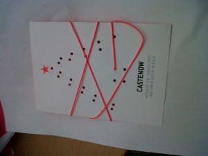 Für Adressaten mit viel Zeit und Muße, aber auch Geschick, ist diese Karte einer Düsseldorfer Werbeagentur etwas: Man soll den Faden durch die Löcher bugsieren, bis man den Umriß des Tannenbaums geschafft hat.