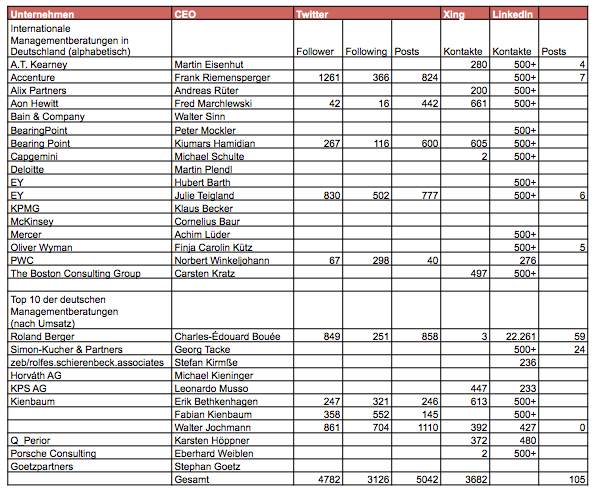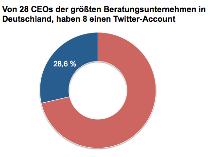 Was am Ergebnis überrascht: „Manches Beratungsunternehmen kritisiert die Vorstände von DAX-Konzernen dafür, im Social Web zu wenig aktiv zu sein – und nutzt dann selbst kein Twitter-Profil.“ Gemeint ist Finja Carolin Kütz an der Spitze von Oliver Wyman, die auf „zeit.de“ sagt: