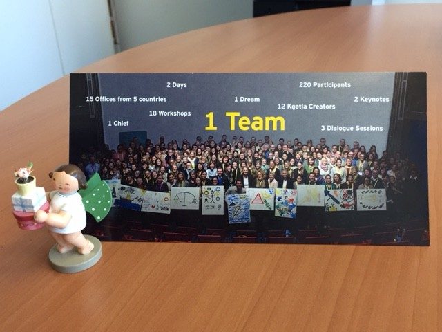 Auf Ana-Cristina Grohnerts Schreibtisch steht dieser Engel, er ist ein Geschenk eines Kunden für ein tolles Großprojekt im Bankenbereich. Dahinter steht „ein Teamfoto von EY Talent am Ende eines supertollen Strategiemeetings“, erzählt sie.