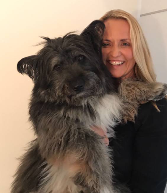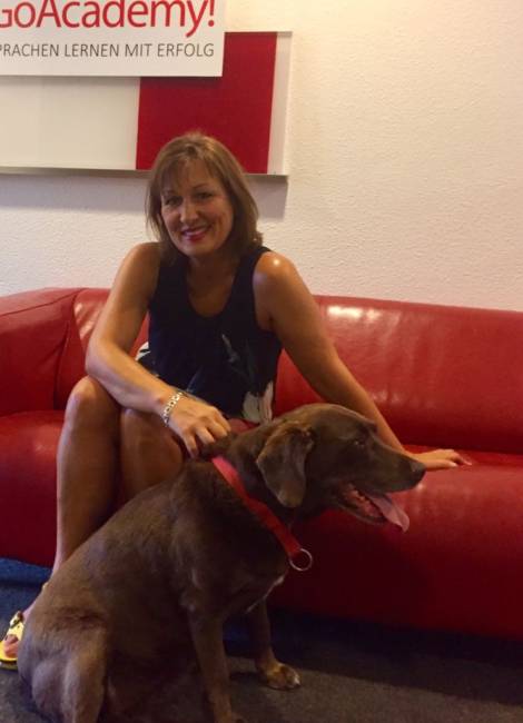 Catherine Thellier, Mitinhaberin der Sprachschule GoAcademy! Sprachcaffe Düsseldorf mit ihrer Labrador-Hündin Kimba