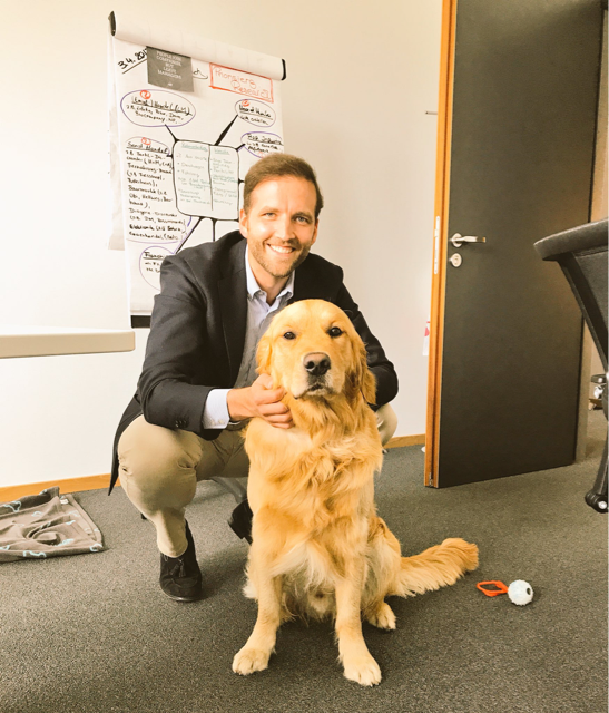 Fabian Kienbaum, Junior-Chef der Management-Beratung Kienbaum Consultants International am Berliner Standort mit dem Bürohund Eddy – einem Golden Retriever.