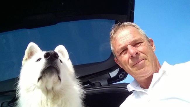 Jürgen Loschelder, Head of Global Travel Management bei ThyssenKrupp, mit Floyd, seinem Weißen Schäferhund.
