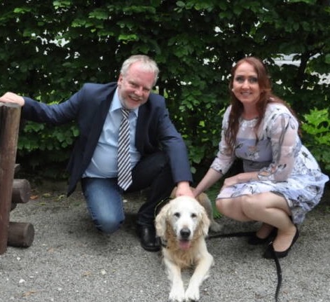 Die Management-Blog-Leser grüßen die beiden Chefs vom Bundesverband Bürohunde e.V.: Markus Beyer mit Bürohund Chester, einem 13 Jahre alten Golden Retriever, und Yvonne Kumar.