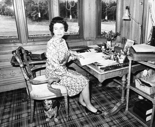 Und hier noch ein Bild der Queen mit ihren Corgis : „The Queen, sitting on a grassy bank with the corgis, at Virginia Water to watch competitors, including Prince Philip in the Marathon of the European Driving Championship, part of the Royal Windsor Horse Show.“