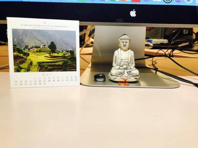 Den Buddha hat Uwe Mommerts Kommunikationschefin aus Asien mitgebracht. Er hatte sie vor dem Urlaub „um eine kleine Portion asiatische Gelassenheit als Mitbringsel“ gebeten. „Damals wusste ich noch nicht, dass ich eines Tages sogar regelmäßig in ein Zen-Kloster fahren würde, um Ruhe und Energie zu tanken“, erzählt er. Jetzt sitzt der Buddha unter seinem Monitor und beruhigt ihn, „wenn es nötig ist“.