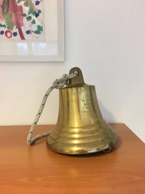 Diese Schiffsglocke ist Geschenk von Ex-Mitarbeitern anlässlich Mirko Siepmanns Verabschiedung. Sie hat eine Gravur mit den Worten „Für unseren 1. Steuermann“. Auch sonst verbindet Siepmann viel mit Glocken: „Eine glückliche Kindheit im Pfarrhaushalt, das eindrucksvolle Geläut des Kölner Doms in meiner Heimatstadt und meine Liebe zur See und dem Kuhgeläut in den Bergen.“