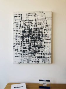 Dieses Bild gegenüber von Claudia Freses Schreibtisch stammt von ihrem Ehemann, dem Künstler Jörg Reckhenrich. Frese schätzt an diesem Bild mit der „mehrdimensionalen Rasterstruktur, die gleichzeitig sehr komplex und ganz leicht aussieht“, dass es „so wirkt, als ob man ganz tief hineinschauen kann. Und das finde ich so schön.“