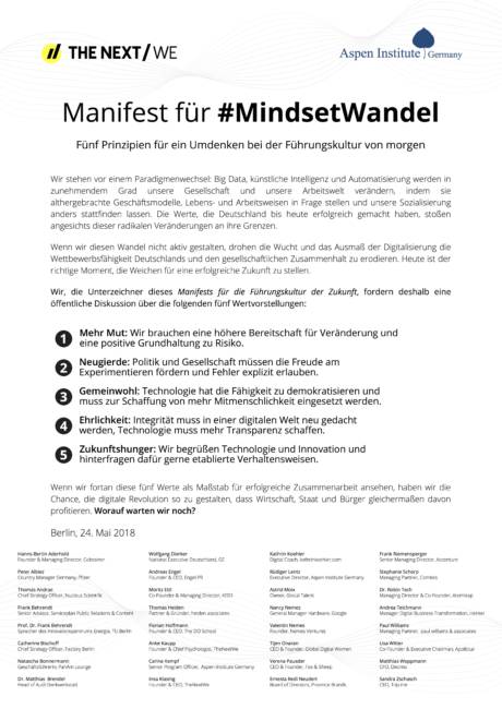 Zusammen getrommelt hat diese ungewöhnliche Allianz fürs erste 33 Persönlichkeiten aus Wirtschaft, Gesellschaft und Politik – so wie Frank Riemensperger von Accenture oder Peter Albiez von Pfizer. Beteiligt sind an diesem Manifest außer den Gründern und Managern auch Start-up-Inhaber und Nichtregierungsorganisationen (siehe Liste unten). Dabei heraus gekommen ist ein Manifest aus Fünf Werten, das die Grundlage für das Führungsverhalten von morgen bilden sollen.