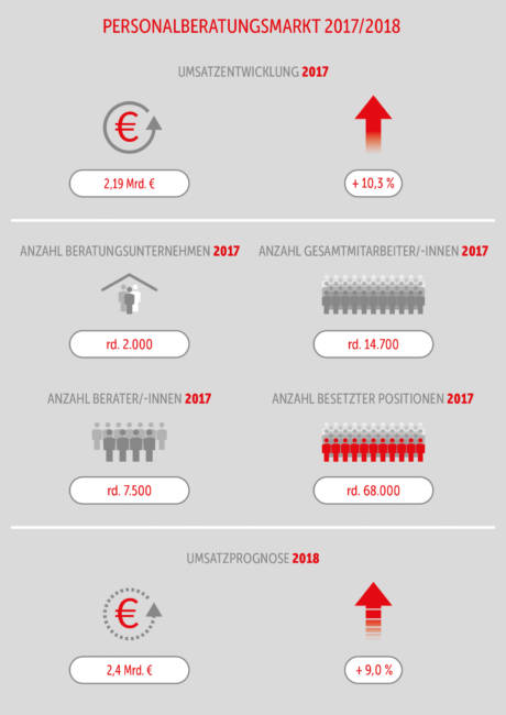 Zum Vergleich: Im Jahr zuvor waren es 1,99 Milliarden Euro, die die Unternehmen hierzulande für das Lösen ihrer Personalprobleme an externe Berater zahlten – das sind zehn Prozent mehr im Vorjahresvergleich. So viel wie nie zuvor: „Ein neuer Höchststand“, ordnet der Bundesverband Deutscher Unternehmensberater (BDU) ein. Insgesamt zählt die Personalberaterbranche 2.000 Beratungsunternehmen – die Zahl ist unverändert seit fünf Jahren – und 7.500 Berater (das waren vor fünf Jahren erst 5.700, also 32 Prozent weniger). Die Branche beschäftigt insgesamt 14.700 Menschen, knapp 34 Prozent mehr als vor fünf Jahren.