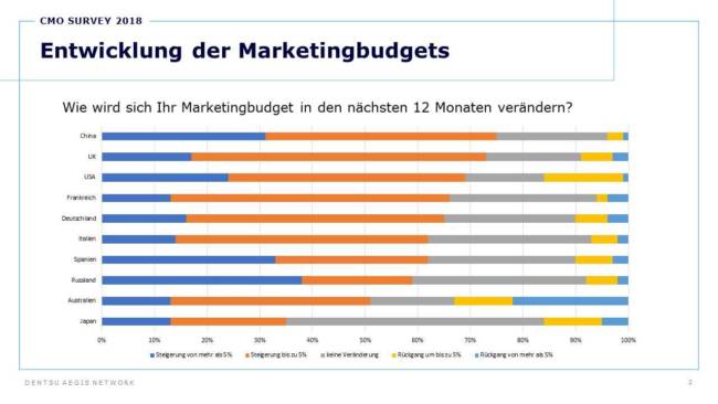 Weltweit steigen die Ausgaben der Unternehmen fürs Marketing, ergibt eine Umfrage der Agenturgruppe Dentsu Aegis Network. Jeder zweite Marketingchef in Deutschland erwartet, dass sein Budget in den nächsten zwölf Monaten um bis zu fünf Prozent höher wird.  Weitere 16 Prozent der Marketing-Bosse sind sogar so optimistisch, dass sie sich noch mehr vorstellen können.