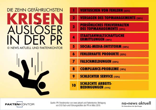 Was sind aus Sicht der PR-Profis die gefährlichsten Krisenauslöser für Unternehmen? An erster Stelle steht das Vertuschen von Fehlern mit 63 Prozent. Weit danach erst folgen Versagen des Topmanagements und persönliche Fehler des Topmanagements. Diese Ursachen sind klar selbst verschuldet, ordnen die Urheber dieser Umfrage – News aktuell und die Kommunikationsagentur Faktenkontor mit einem Trendmonitor, für den 510 Fach und Führungskräfte der PR befragt werden – ein.