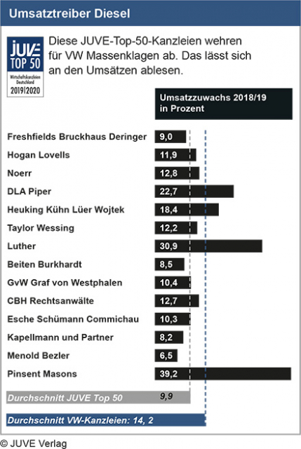 Allein 15 der „Juve“-Top-50-Kanzleien wehrten für VW Klagen von Dieselkäufern ab. Hinzu kämen weitere Kanzleien, die im Großeinsatz für VW sind: Beispielsweise Gleiss Lutz für den Aufsichtsrat sowie Hengeler Mueller und SZA Schilling Zutt & Anschütz für Porsche und VW bei der Abwehr von Kapitalanlegerklagen im Dieselkomplex, so „Juve“.