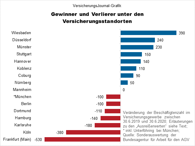 … und in welchen Städten Versicherungen in 2020 im Vergleich zum Vorjahr mehr Leute einstellten oder entließen: In Wiesbaden , Düsseldorf und Münster entstanden die meisten neuen Arbeitsplätze bei Assekuranzen, die meisten Entlassungen gab es in Frankfurt, Köln und Karlsruhe.