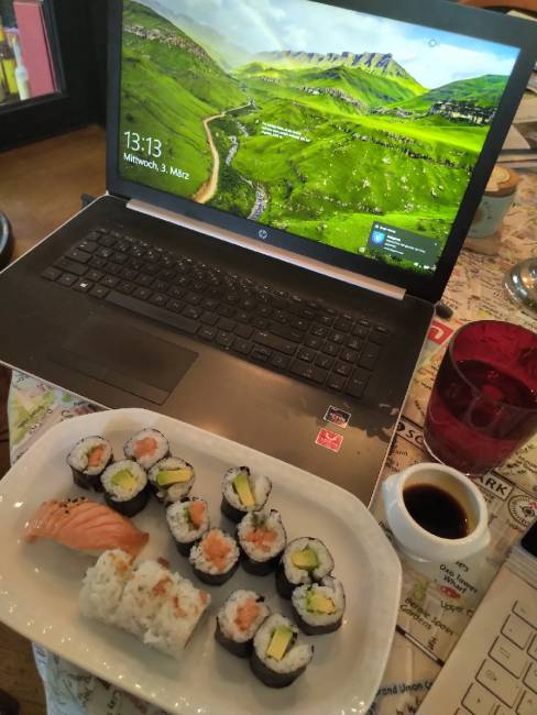 Die Pandemie war denn auch der Grund, warum wir uns nicht persönlich zum Lunch treffen konnten, sondern nur im Zoom-Call und dass es Take-away-Essen gab. Sushi mit Acocado und Lachs samt den Sojabohnen kann man auch am PC nebenbei essen, kalt werden sie jedenfalls nicht.
