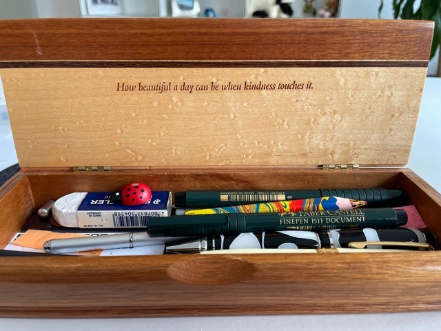 Die Schatulle auf Angela Westdorfs Schreibtisch ist ein Mitbringsel von einer Firmenkonferenz in Chicago und trägt den Spruch, der auch ihr Motto wurde: „How beautiful a day can be when kindness touches it“ (Übers.: „Wie schön kann ein Tag sein, wenn Freundlichkeit ihn berührt.“). In der Coronazeit haben wir per Zoom einen täglichen Jour Fixe gemacht, bei dem jeder mit einer positiven Nachricht beginnen musste, die keinen beruflichen Bezug hatte. Das konnten ganz harmlose oder nebensächliche Dinge sein. Hauptsache, wir teilen schöne Momente miteinander – auch oder gerade in dieser besonderen Zeit.