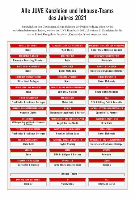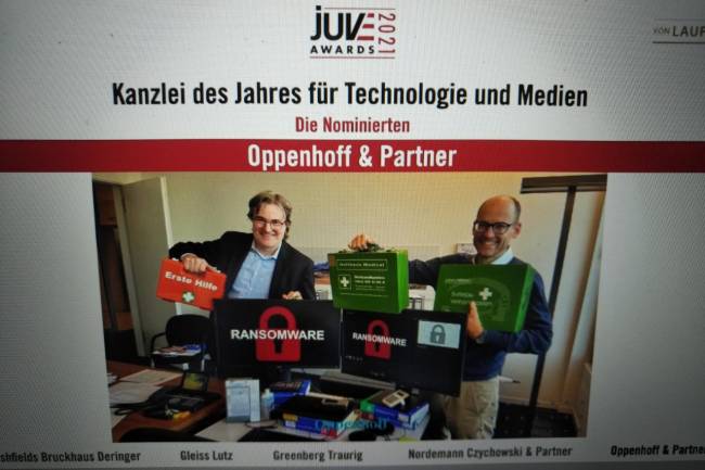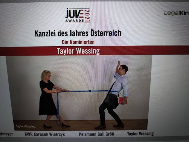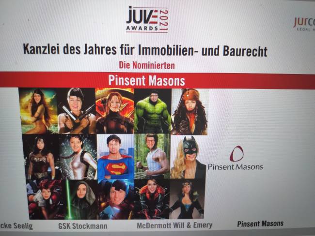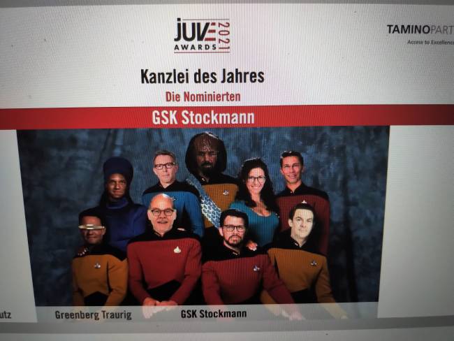 Die Lieblings-Accessoires waren bei den Foto-Vorstellungen der Anwälte und Ihrer Kanzleien bei den #JuveAwards2021 an erster Stelle und mit großem Abstand die Masken. Ausgerechnet. Kaum kommen sie mal zu Ehren, verstecken sie sich hinter Masken? Auf den Mosaikbildchen mit ganz vielen klitzekleinen Anwälten hat´s sicher nicht geschadet, da erkennt man ohnehin keinen. Schade ist es aber um die größeren Bilder wie von fünf Oppenhoff-Juristen, die IP-Anwälte von Rohe & Schwarz, Continental oder ein Dispute-Resolution-Team von Freshfields.