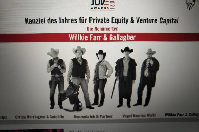 Kanzlei Gütt Olk Feldhaus fiel mit dem Bekenntnis zum Trachtenlook, also Krachledernen, Jankern und genau einem Dirndl auf. Auch bei Luther gab´s Trachtenträger, die mit Bierhumpen aus München zuprosteten, bei Freshfields hielten die Trachtenträger rätselhafterweise Pizzakartons. Ego Humrich hatte sich direkt auf eine Alm fürs Foto begeben und posierte hinter einer Kuh.