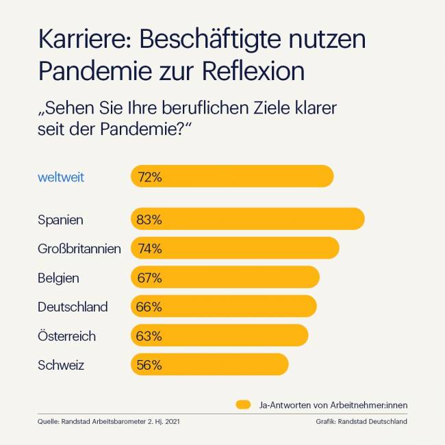 Das Resüme: Seit Corona sieht die Mehrheit der Beschäftigten berufliche Ziele klarer, vermeldet der Personaldienstleister Randstad. Aufbruchstimmung war angesagt nach der Reflexion. Wie Arbeitnehmer ihre Ziele neu sortieren: Im Schnitt sähen 72 Prozent der Arbeitnehmer weltweit ihre beruflichen Ziele seit der Pandemie klarer. Deutschland läge etwas unter dem Schnitt, hier seien sich zwei Drittel der Mitarbeiter (66 Prozent) über ihre beruflichen Ziele im Klaren geworden.
