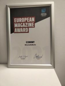 Die vorderen sieben Preise sind vom ICMA-Award, die drei hinteren, die Gerahmten, sind vom „European Publishing Award“ für die besten Magazine, Zeitungen und digitalen Medien Europas. Da hat die „WirtschaftsWoche“ in den Kategorien „Wirtschaftsmagazin“, „Cover Concept“ und „Special Interest“ gewonnen.