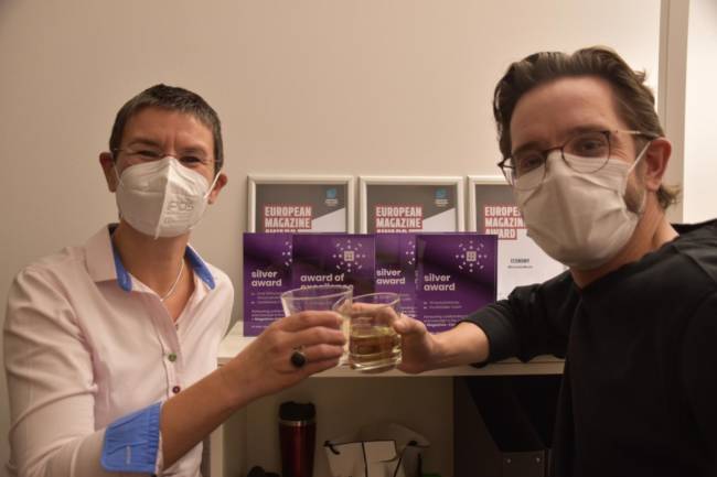 Neun Awards gab´s für die WirtschaftsWoche-Redaktion. Darauf haben die Verantwortlichen Patrick Zeh, unser Art Director, und Silke Eisen, unsere Chefin der Bildredaktion mit mir angestossen – ein Elbling Cremant Brut war´s aus Nittel an der Mosel.