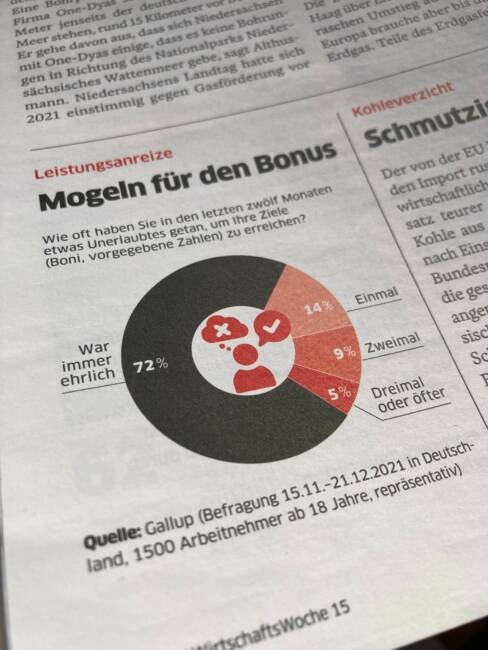 Das Beratungs- und Marktforscher Gallup hat bei seiner großen Umfrage jetzt die Leute gefragt, ob und wie oft sie in den vergangenen zwölf Monaten für ihre Boni gemogelt haben. Die genaue Frage lautete: Wie oft haben Sie in den letzten zwölf Monaten etwas Unerlaubtes getan, um Ihre Ziele (Boni, vorgegebene Zahlen) zu erreichen?
