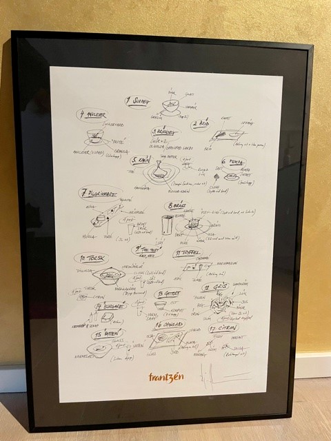 „Dieses Foto hängt in meinem Büro an der Wand und ist eine Skizze ist vom weltbesten Drei-Sterne-Koch Björn Frantzén aus Stockholm“, erzählt Tilman Au. Und weiter: „Sie zeigt, wie ein 14-Gänge-Menue entsteht und ist von ihm signiert. Das Foto erinnert mich immer daran, dass Kreativität und Präzision Hand in Hand gehen müssen.“