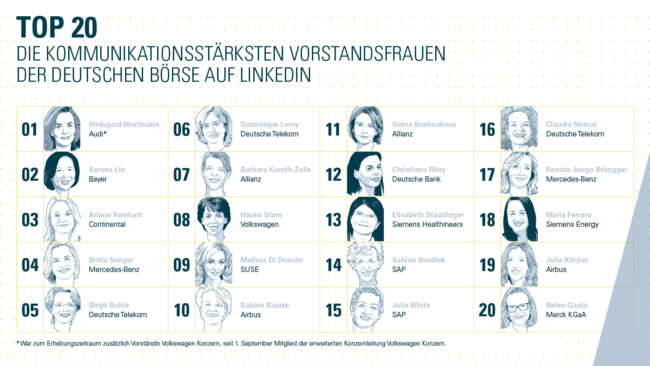 Die Kommunikationsagentur Palmer Hargreaves hat die Kommunikation der 88 Top-Managerinnen im H-Dax auf der Business-Plattform LinkedIn im zweiten Quartal 2022 ausgewertet. Das Ergebnis: An der Spitze steht Hildegard Wortmann von Audi – beziehungsweise zuvor VW – gefolgt von Sarena Lin von Bayer und Ariane Reinhart von Continental.