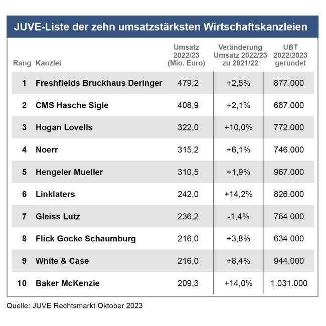 Die Top-Five der umsatzstärksten Kanzleien sind wie im Vorjahr Freshfields Bruckhaus Deringer, CMS Hasche Sigle, Hogan Lovells, Noerr und Hengeler Mueller.