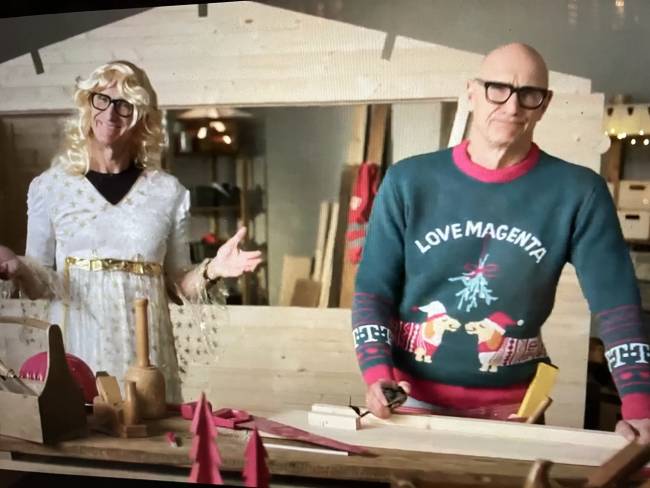 Telekom -Chef Tim Höttges hat wieder ein schönes Weihnachtsvideo geliefert, in dem er nichts ausgelassen hat. Um nicht zu sagen, Werbung in jeder Ecke, aber egal, denn ist einfach zu nett anzusehen: Seine beiden Dackel Otto und Anton kommen vor, in echt und auf Höttges´ Strickpullover. Auf den Pullover-Ärmeln sind große Telekom-T´s gestickt, auf seiner Brust steht „Love Magenta“. Sein Bauarbeiter-Helm, seine Bohrmaschine, seine Säge und sein Hammer sind magentafarben, er baut und zählt alle Awards auf, die die Telekom 2023 so einheimste, um sie mit einem Rutsch wieder abzuräumen.