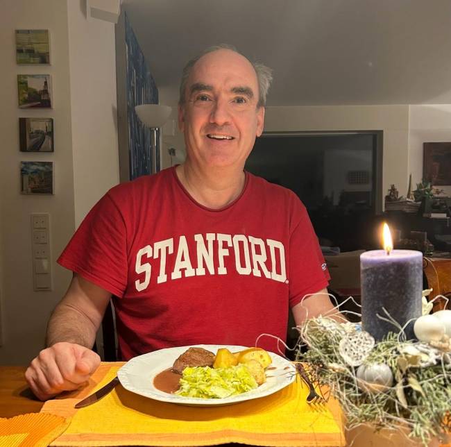 Doch – ersatzweise – schickte er für die Management-Blog-Leser sein Foto mit einem Teller Rinderfilet, das ihm seine 13-jährige Tochter zuhause gebraten hat. Und deshalb trägt er zur Abwechslung statt Jackett ein T-Shirt.
