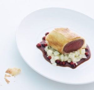 Reh im Strudelmantel auf rahmigem Kohlrabigemüse und Preiselbeeren