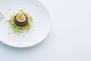 Kurz gebratenes Rindertatar mit Wachtelspiegelei auf Spitzkohlsalat