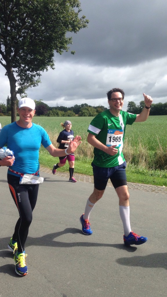 Ich war in einen bewegten Klönschnack geraten, hielt eine Tüte und eine von zwei Getränkeflaschen, weil Thomas H. ja Erinnerungsfotos schießen wollte und dafür sein Mobiltelefon in der einen Hand hielt. Ich bin unsicher, was die Mitläufer in unserer Umgebung gedacht haben. Ich weiß, was ich gedacht hätte, wenn ich einer von ihnen gewesen wäre. Es war dann auch noch Zeit, die Vor- und Nachteile des Ortes Roxel zu debattieren (offensichtlich nur Nachteile, ich selber fand es eigentlich ganz nett), Bekannte an der Strecke zu begrüßen. Und meine Tüte mal von der linken zur rechten Hand zu wechseln. Immer häufiger, denn so ein Ding wird ziemlich nervig auf die Dauer.