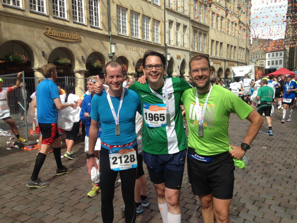 Münster, 6. September 2015, 8:30. Thomas K. hat beste Laune. Es sind schnattrige 14 oder 15 Grad Celsius, die Laufhose sitzt, die letzten Tweets sind geschrieben und unser Geschenk, das er sich am Ende ja doch irgendwie selber nach Hause tragen muss, wird übergeben. Thomas K. händigt seine präparierten Getränkeflaschen mit Verabreichungshinweisen an Thomas H. und mich aus. Ich selber nehme meine Tüte. Denn ich habe vergessen, mich so zu organisieren, dass ich Telefon, Portemonnaie und T-Shirt für nach dem Lauf abgeben kann. Ich muss den Kram also mitnehmen.