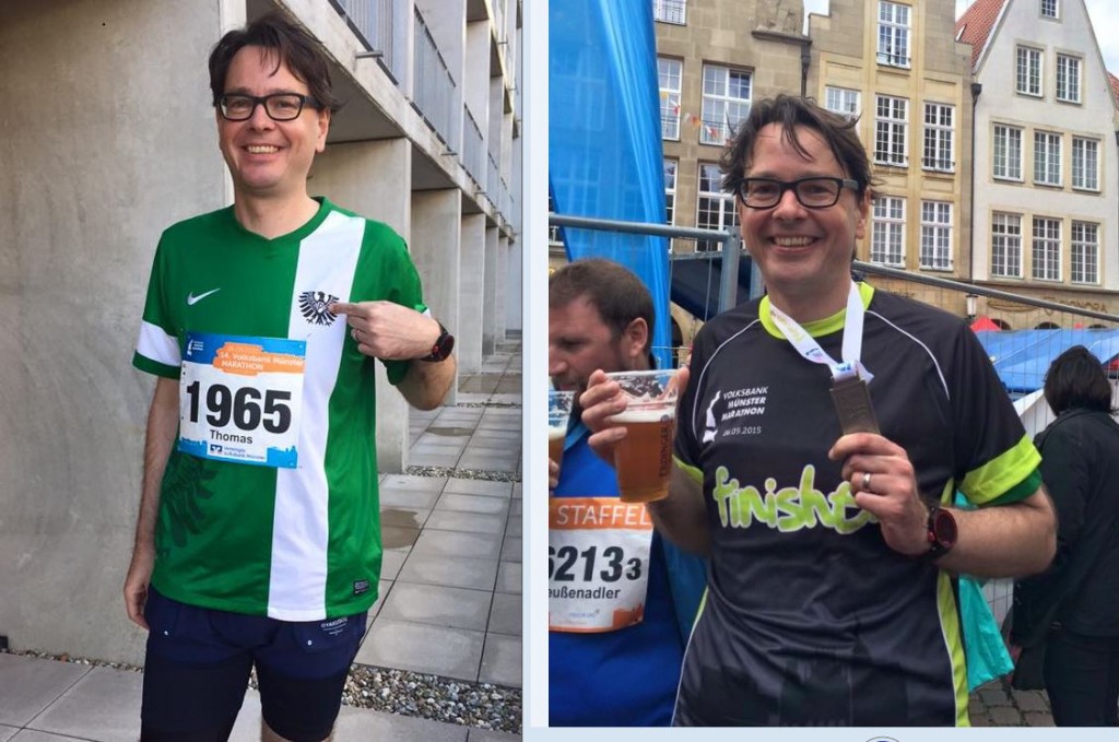 Eine Zeit. Eine Bestzeit. Die Marathonbestzeit. Thomas Holzapfel suchte auch noch ein Geschenk für Thomas K.. Thomas H. ist ein Nicht-Journalist, hat also was anständiges gelernt und läuft dennoch ziemlich fix. Auch lang. Sowohl Thomas H. als auch ich waren bei verschiedenen Marathons schon Ballonläufer und wir teilen unterschiedlich schöne Erinnerungen an den gemeinsamen Start beim Röntgenlauf 2014. Also schenkten wir – in Ermangelung einer wirklich guten Geschenkidee – eine Rund-Um-Sorglos-Betreuung für den Marathon in Münster. Zielzeit: Vier Stunden und dreißig Minuten, das wären 11 Minuten weniger als Thomas K. bislang als Bestzeit stehen hat.