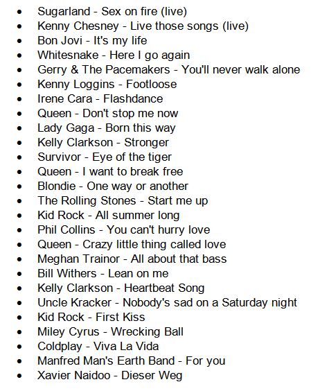 Dennoch möchte ich statt der im Titel angekündigten 10 immerhin drei (naja, vier) Tracks verraten, die ich als „Werkzeug“ beim Laufen einsetze. In den Bildern wiederum sind Playlists von befreundeten Läufern, die mir netterweise ihre Auswahl mitgeteilt haben. Und ich verrate nicht, wer was hört.