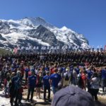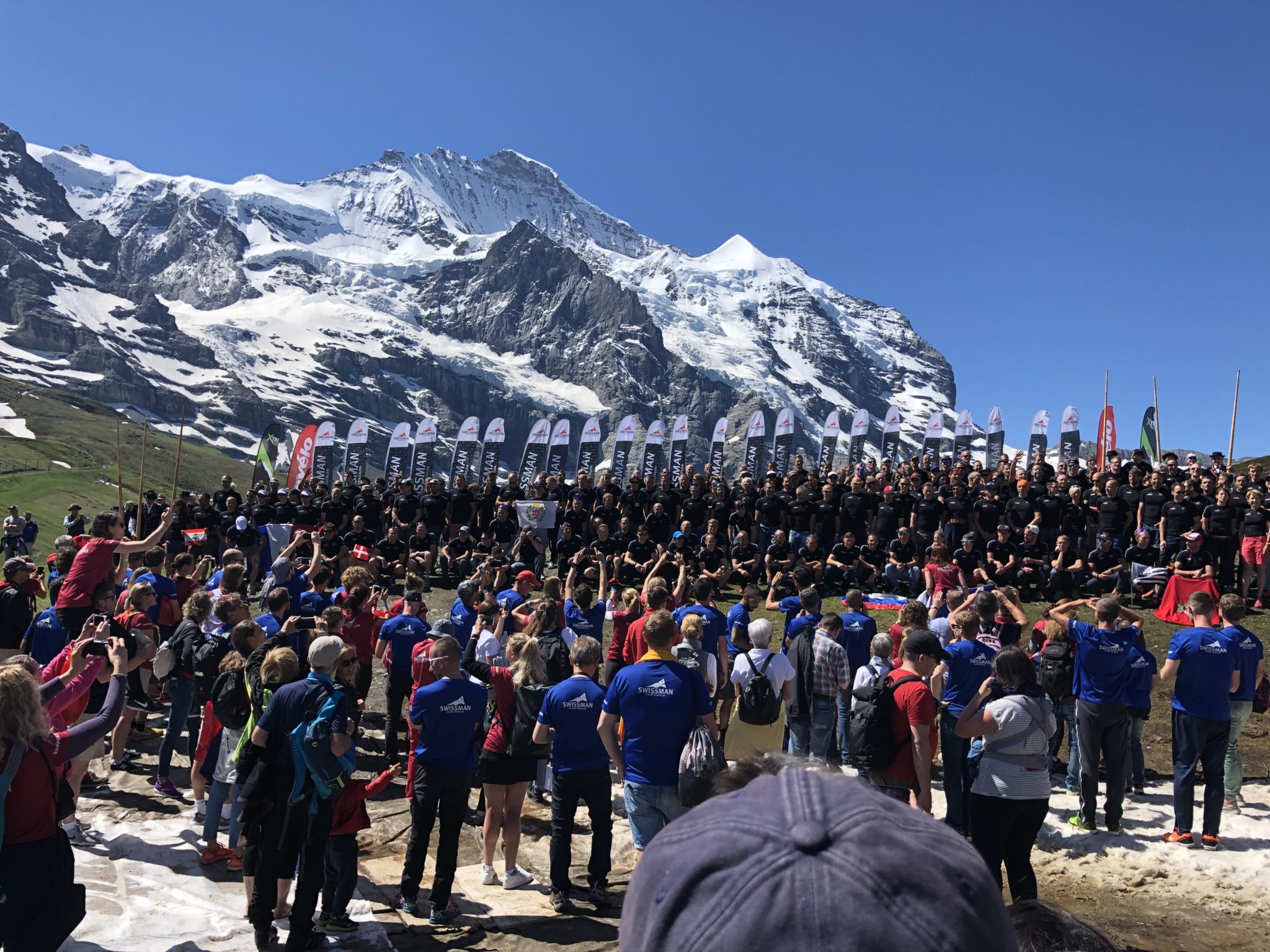 Die große Gemeinschaft aller Athleten (213 Starter waren morgens los geschwommen) mit ihren Supportern (vermutlich 5-600) versammelte sich vor der Kulisse der Jungfrau. Ein gelöste, heitere, vibrierende Stimmung. An der wohl fast alle teilnahmen, die tags zuvor gestartet waren. Wer das Schwimmen überstanden hatte – okay, das war keine Herausforderung. Aber wer einen der Pässe, aber ganz sicher drei von diesen Monstern überstanden hatte, und dann noch die Kraft hatte, sich aufzurichten und loszulaufen – der hatte Enormes vollbracht. Die Radprofis der Tour de Suisse sind am Sonntag den Furkapass bei der 9. „fulminanten Königsetappe“ hochgefahren – auch für die ein „Scharfrichter“, wie ein ehemaliger Swissman-Teilnehmer den Furkapass nannte.