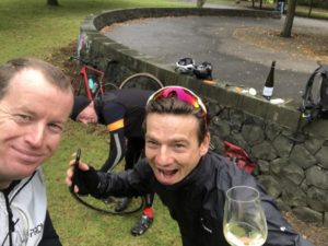 Danach entsponn sich auf facebook mit Michael und Thomas eine kurze Diskussion, ob man wohl den Zucker aus Elektrolyten auch durch Kabinettwein ersetzen könne. Für die Biertrinker: Das ist Wein mit hohem Anteil an Restzucker und eher 7-9 Prozent Alkohol. Haben wir dann zu dritt gemacht. Am 3. Oktober. 170 Kilometer von Köln nach Bingen. Um 7:00 los, gegen 8:30 erster Platten und erste Flasche Kabinett geteilt. Geht. Notiz an mich selbst: Nächstes Mal wie Thomas ein Glas mitnehmen. Aus dem Deckel der Trinkflasche schmeckt es nur so halb.