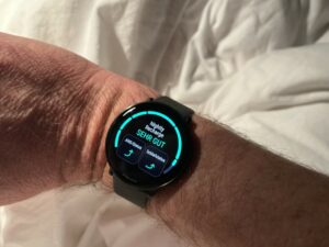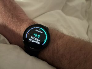 Während der Einheit führt die Uhr einen sehr klar und deutlich durch die vorgeschlagenen Phasen. Wer mag, ich empfehle das, liest sich vorher die Schritte durch. Das größte Manko der Uhr, deren Display sich wegen des höheren Stromverbrauchs als herkömmliche automatisch abschaltet, ist, dass es schwierig als es sinnvoll ist, sich unterwegs die Daten aufzurufen. Die Uhr vibriert und als Läufer will ich natürlich wissen, wo ist mein Puls und wie viel ist er zu hoch. Es braucht dann schon eine sehr präzise und möglichst immer gleich Bewegung, die die Uhr richtig interpretiert und das Display aufleuchten lässt. Aber selbst wenn sie es tut – immer mit einer winzigen aber störenden Verzögerung. Ob sich das in einem Update ändern lässt oder der Bewegungssensor so ist, wie er ist, wird sich zeigen. Die bisherigen Updates brachten keine Besserung.