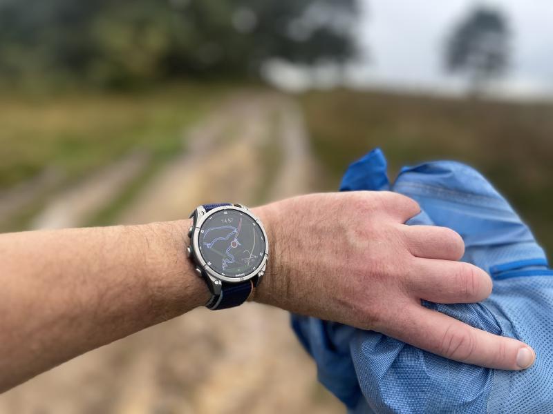 Das Amoled-Display ist selbst bei bestem britischen Wetter selbstbewusst hell und kontrastreich. Auch die Sorge, dass bei ständigem Prüfen des Pfades dem Akku angesichts der Dauer an Leuchtkraft, die Luft ausgeht – abwegig. Das reicht auch noch für die nächste Wanderung. Meinen Iroman Wales habe ich in kühner Selbstsicherheit mit einer gar nicht voll geladenen Uhr absolviert. Und hätte sogar noch länger als die eh schon ewig langen 15h brauchen können. Gut – navigieren musste ich an dem Tag nicht.